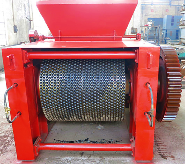 工作原理:通過減速機將動力同時傳遞給兩個壓輥,并使兩個壓輥相向轉(zhuǎn)動,在兩個壓輥轉(zhuǎn)動中,物料自然進入壓輥上的球模中,隨著壓輥的轉(zhuǎn)動,物料承受的壓力有小變大,當(dāng)物料轉(zhuǎn)動到兩輥的線接觸點時,物料承受的壓力已達到峰值。在巨大線壓力的作用下,物料由粉狀成為成品球。